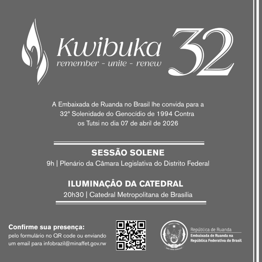 A Embaixada de Ruanda no Brasil promove, no próximo dia 7 de abril de 2026, uma programação especial em Brasília em homenagem às vítimas do Genocídio de 1994 contra os Tutsis em Ruanda. A iniciativa integra a 32ª edição do Kwibuka — termo que significa “lembrar” em quiniaruanda — e reforça a importância da memória, da união e da renovação diante de uma das maiores tragédias humanitárias do século XX.