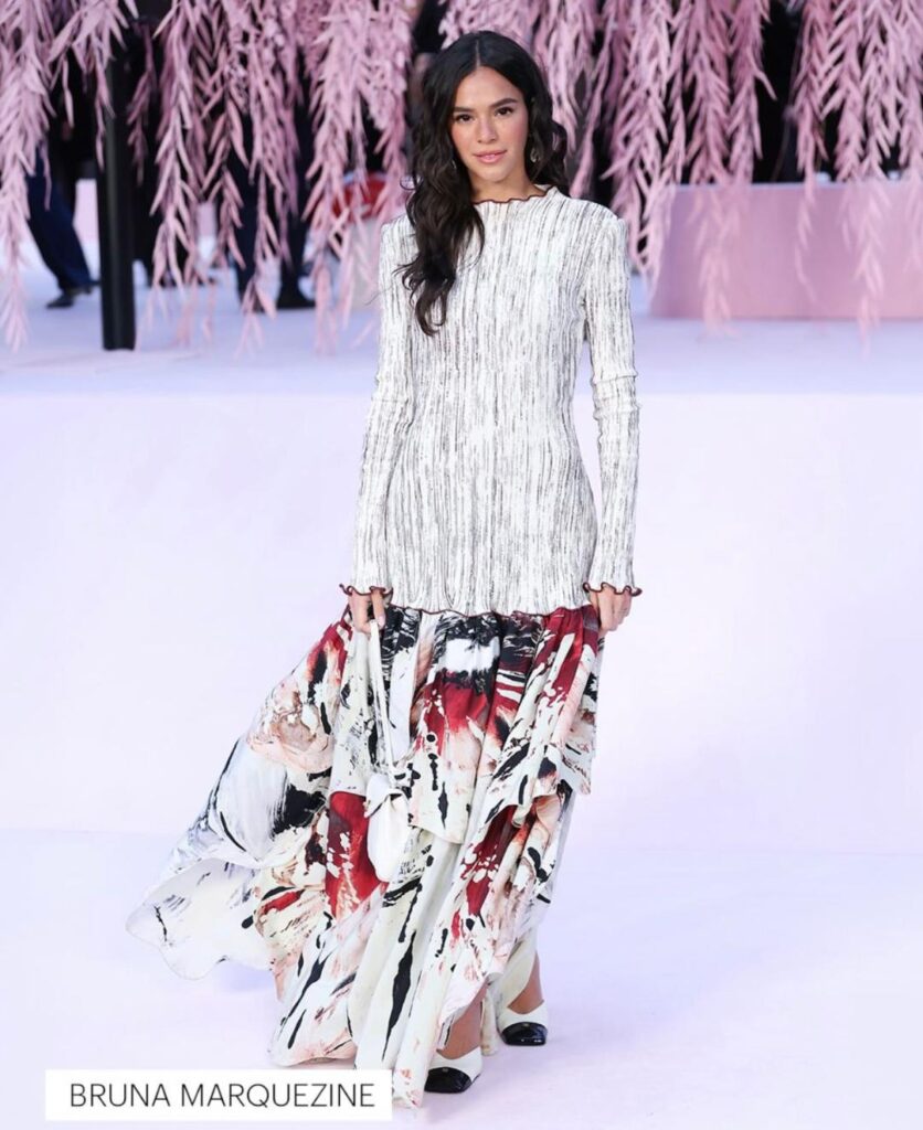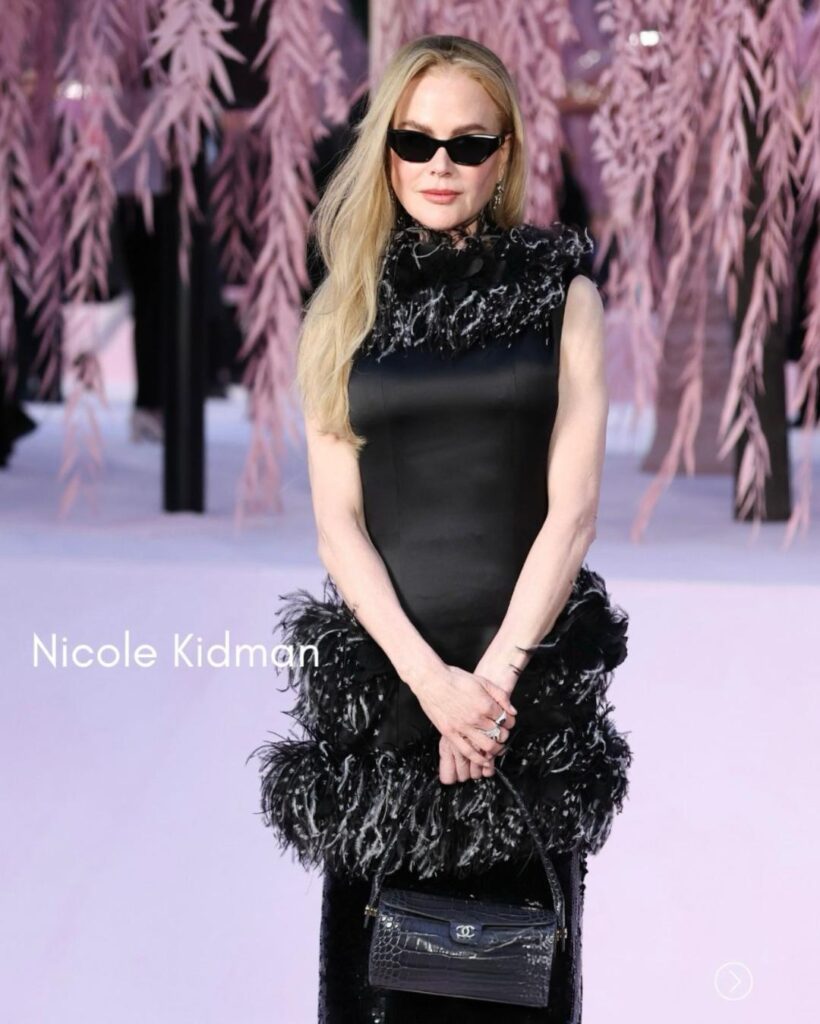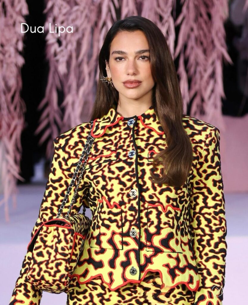 Na primeira fila, celebridades internacionais deram brilho extra ao desfile. Estiveram presentes nomes como Penélope Cruz, que chamou atenção por seu visual sofisticado em preto, Dua Lipa com um conjunto vibrante inspirado nos anos 80, e outras figuras influentes como Nicole Kidman e Tilda Swinton.