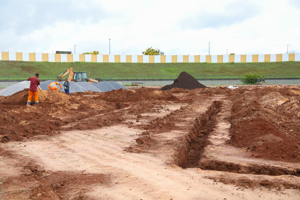 O projeto em andamento prevê a instalação de drenagem em formato de “espinha de peixe”, com tubos de alta densidade, manta geotêxtil e brita para escoamento rápido da água. A estrutura será ligada a um sistema de irrigação automatizada e a um ramal elétrico exclusivo, com controladores que regulam o abastecimento de água entre a cisterna e a rede de alimentação. Depois do preparo do solo e da adubação, o campo receberá grama do tipo Bermuda, usada em competições profissionais pela resistência e pelo desempenho. A empresa responsável também fará a manutenção e o corte por três meses após o plantio.