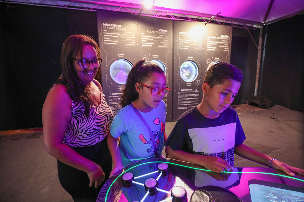 O foguete no centro da sala escura parece pronto para decolar. As luzes piscam, os planetas giram nas telas e, de repente, Eloá Nunes, de 7 anos, acerta a resposta: “Urano é o planeta mais frio do sistema solar!”.