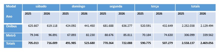 Os ônibus tiveram 2.129.494 embarques nos quatro dias de folia, enquanto o metrô registrou 339.562 acessos. No Carnaval anterior, foram 2.252.038 viagens nos coletivos e 306.099 acessos no metrô. A segunda-feira (16), com os ônibus circulando em horários de dia útil e o metrô com viagens até 1h da madrugada, foram transportados 722.088 passageiros em todo o DF. Houve uma pequena redução de 3,4% no total de viagens, com impacto na segunda-feira e na terça-feira de Carnaval. Veja quadro comparativo ao final da matéria.