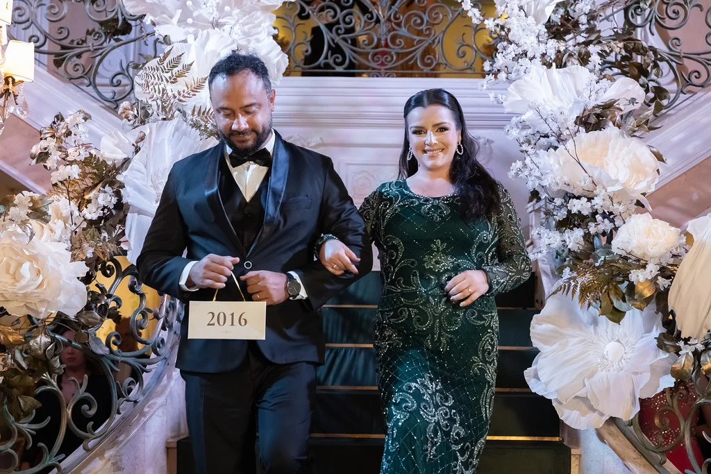 Um dos momentos mais emocionantes da noite foi a homenagem aos clientes que marcaram cada ano da história da Villa. Foram convidados 10 casais, cada um representando um ano da trajetória do espaço. Também participaram uma debutante, simbolizando todos os aniversários celebrados na Villa, e um casal que ainda realizará seu casamento no espaço, representando o futuro.