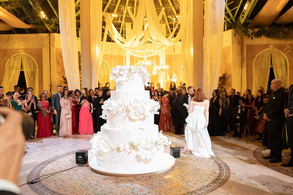 A decoração valorizou a identidade autoral da Vila Giardini, com iluminação cênica sofisticada, muitas flores, velas e elementos que dialogavam com memória, trajetória e celebração.